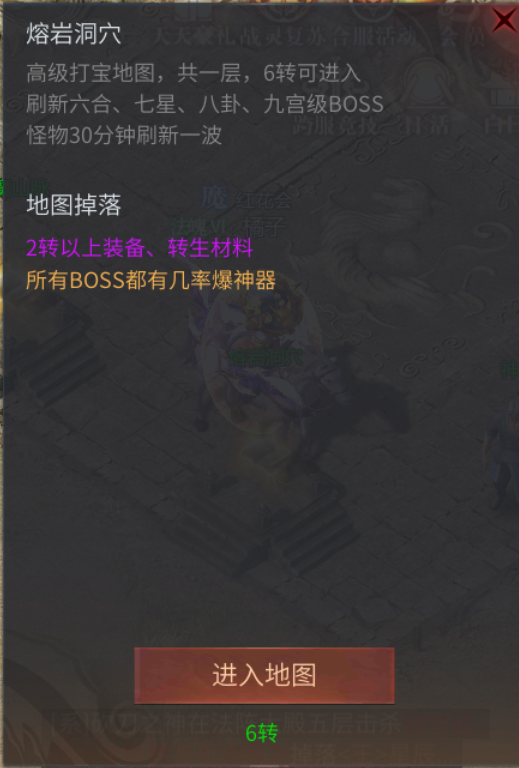 熔岩洞穴属于高级打宝地图,一共一层,里面会出现六合、七星、八卦和九宫级别的boss哦。怪物每30分钟刷新一次哦。