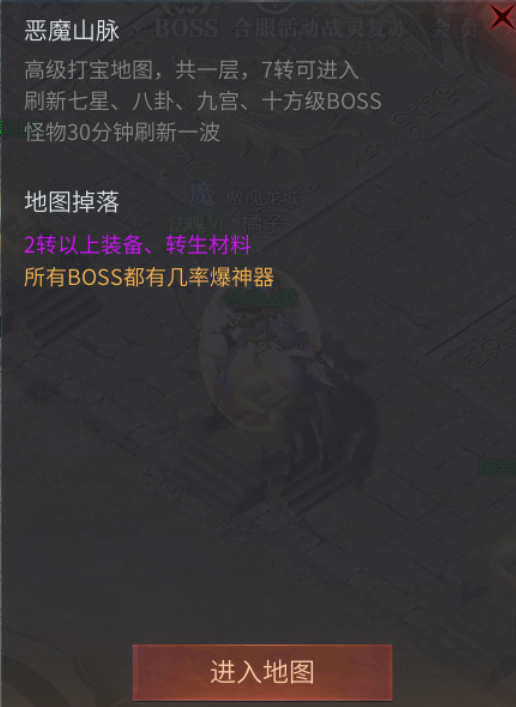 恶魔山脉只有一层,里面会刷新出七星、八卦、九宫还有十方级的boss哦。这些怪物每30分钟刷新一次。