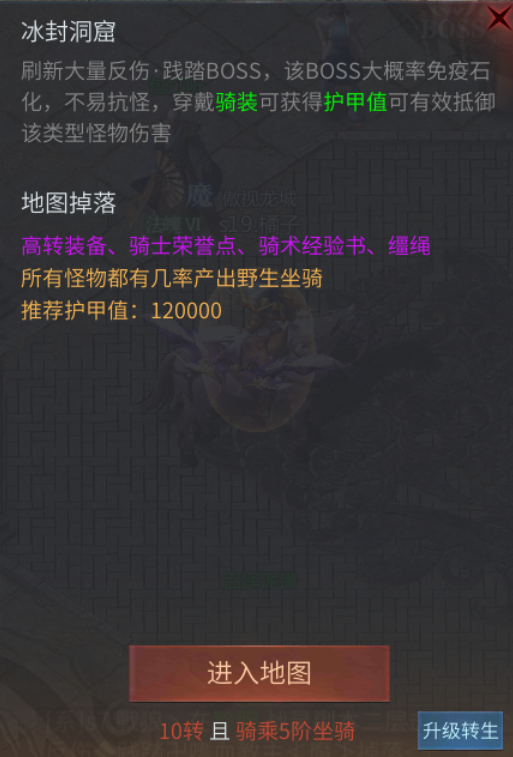 穿戴骑装可以获得护甲值可以有效低于该类型的怪物伤害哦。 在冰封洞窟有可能会掉落高转装备、骑士荣誉点、骑术经验书还有缰绳。这些都是我们平时骑乘什么的必须要用的。