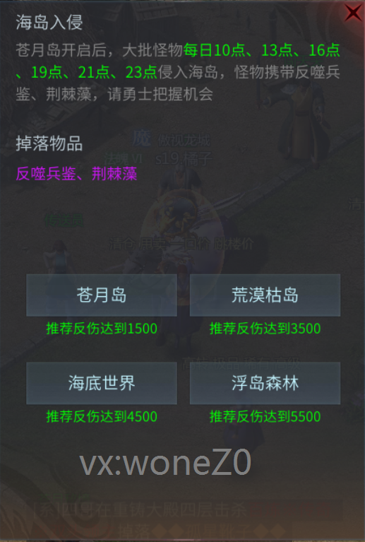这些怪物都携带反噬兵鉴还有荆棘藻,所以各位勇士们一定要把握机会哦。 海岛入侵有四块地图,分别是苍月岛、荒漠枯岛、海底世界还有浮岛森林。进入这些地图都是推荐反伤的,而且越后面的地图推荐的反伤越高,可想而知,怪物也一定是更厉害的。当然,掉落的东西也更好哦。
