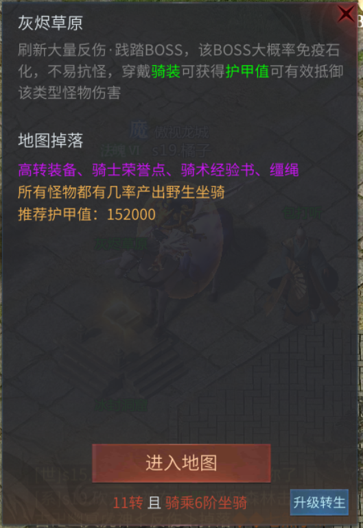 灰烬草原需要达到11转并且还要骑乘6阶及以上坐骑才能进入哦,所以想要进入灰烬草原的小伙伴们要努力了哦。