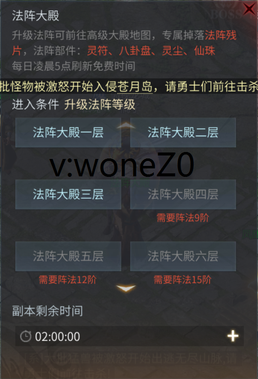 审计法阵可以前往高级大殿地图,在法阵大殿会掉落法阵残片还有法阵部件:灵符、八卦盘、灵尘还有仙珠。
