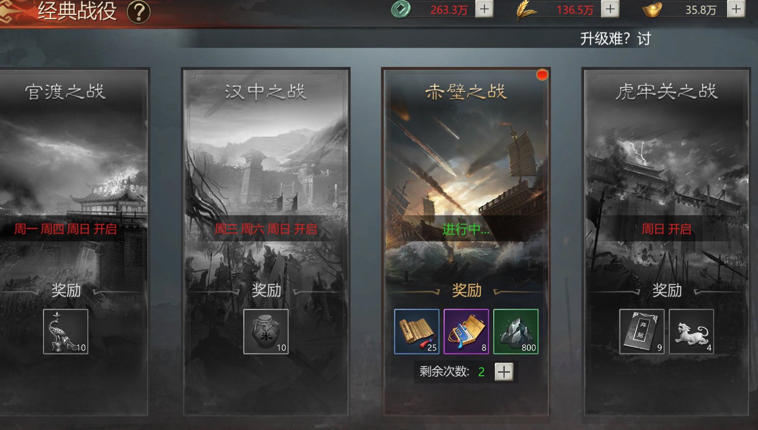 不同周期会开放不同的战役,未开放的战役是不能参加的哦。官渡战役是每周一、周四、周日开启,汉中战役是周三、周六、周日开启,赤壁之战是周五开启,虎牢关之战是周日开启。所以小伙伴们不要错过哦。
