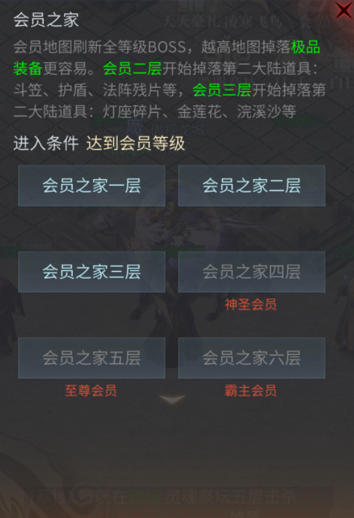 会员之家地图可以在盟重土城找到NPC会员之家进入,这块地图有很多层,达到对应的会员等级才能进入对应的层数。