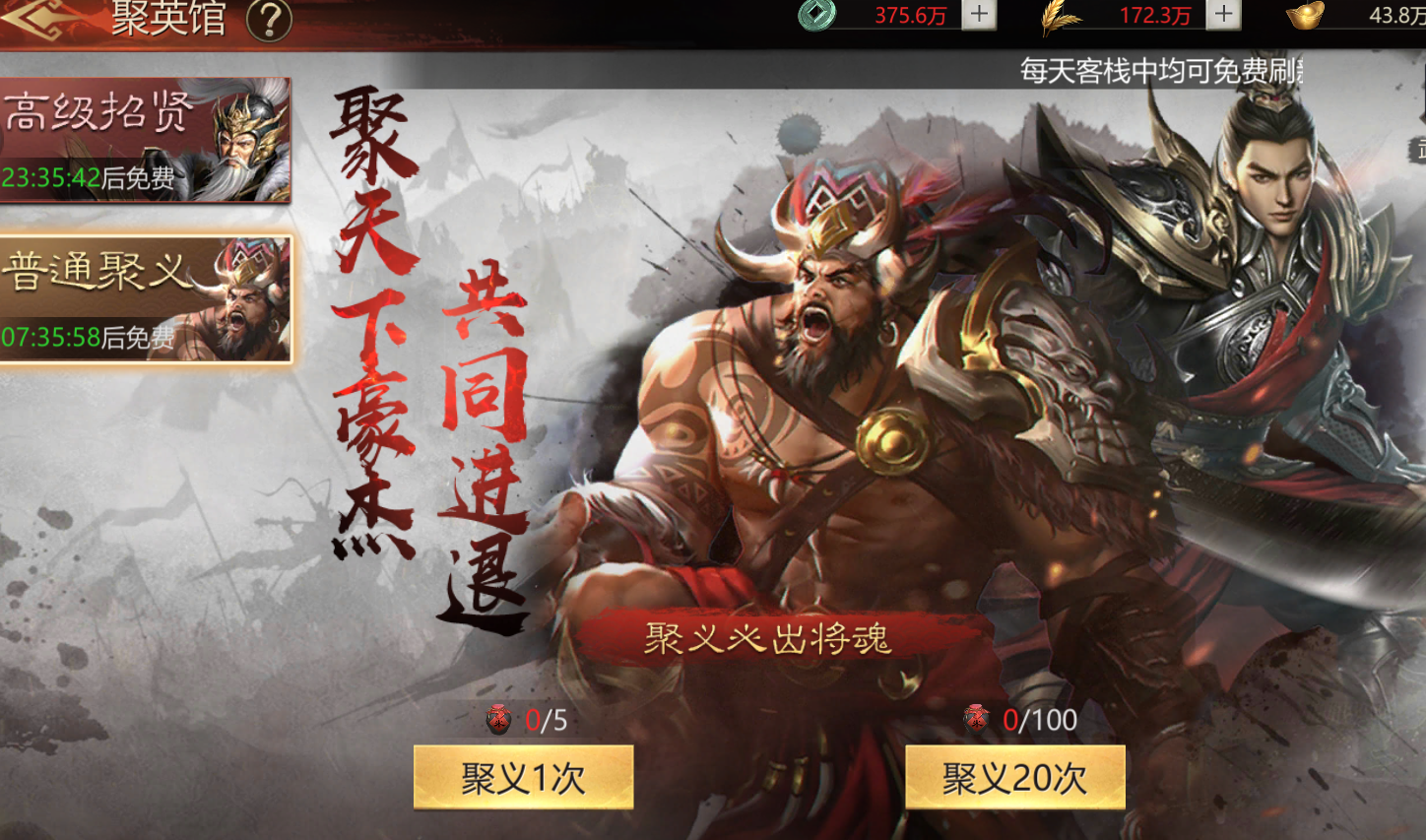 点击聚英馆就可以进入到聚英馆的系统界面当中了,我们可以看到在左侧有两个选项,一个是高级招贤还有一个是普通聚义。高级招贤24小时会刷新一次免费次数,普通聚义则是8小时刷新哦。