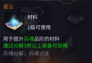 分解3转及以上装备获得星尘,需要注意的是,只能在兵魂系统进行分解才可以获得星尘哦,而不是背包内回收/熔炼。