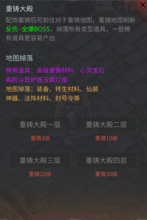 一同名字就知道,这个重铸大殿一定是和我们的重铸系统有关。配饰重铸后我们就可以前往重铸大殿地图啦,重铸地图刷新反伤·全爆BOSS,掉落所有类型道具,一些稀有道具更容易产出哦。