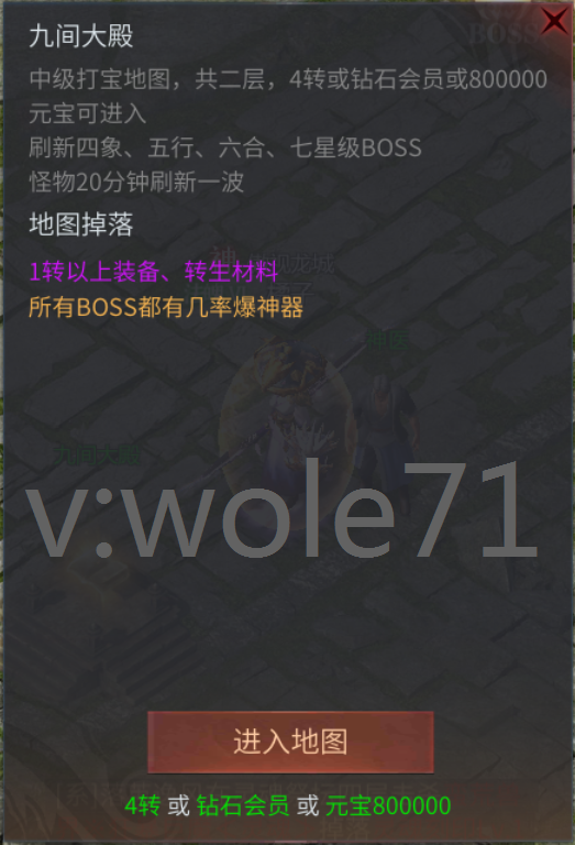 九间大殿是一块中级打宝地图,一共有两层,小伙伴们需要达到4转或钻石会员或800000元宝才可以进入九间大殿哦。