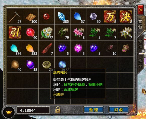 传奇霸主盾牌残片乃是彰显勇士气概的残片,它是一种棕黄色的饼状道具。盾牌残片的主要用途就是帮助玩家,合成各种级别的盾牌装备,从而起到增强角色战斗力的作用。
