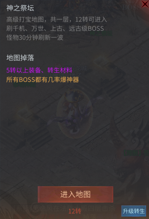 神之祭坛是一块高级打宝地图,共一层,12转可进入。