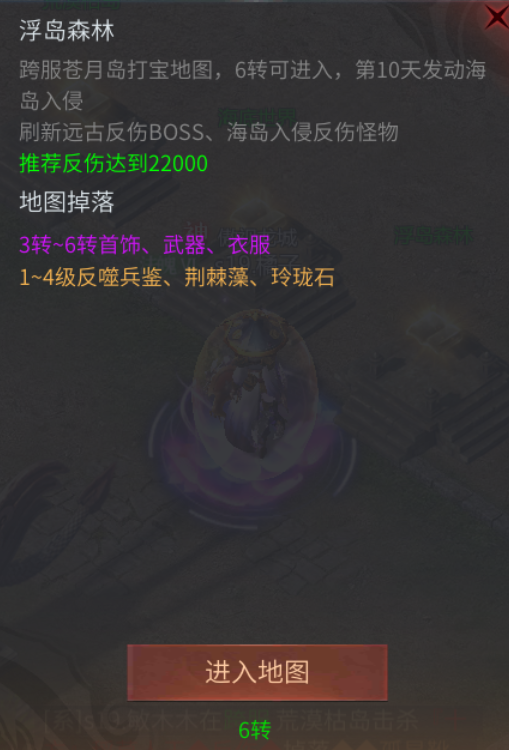 浮岛森林是跨服苍月岛的打宝地图,小伙伴们需要达到6转才可以进入哦。