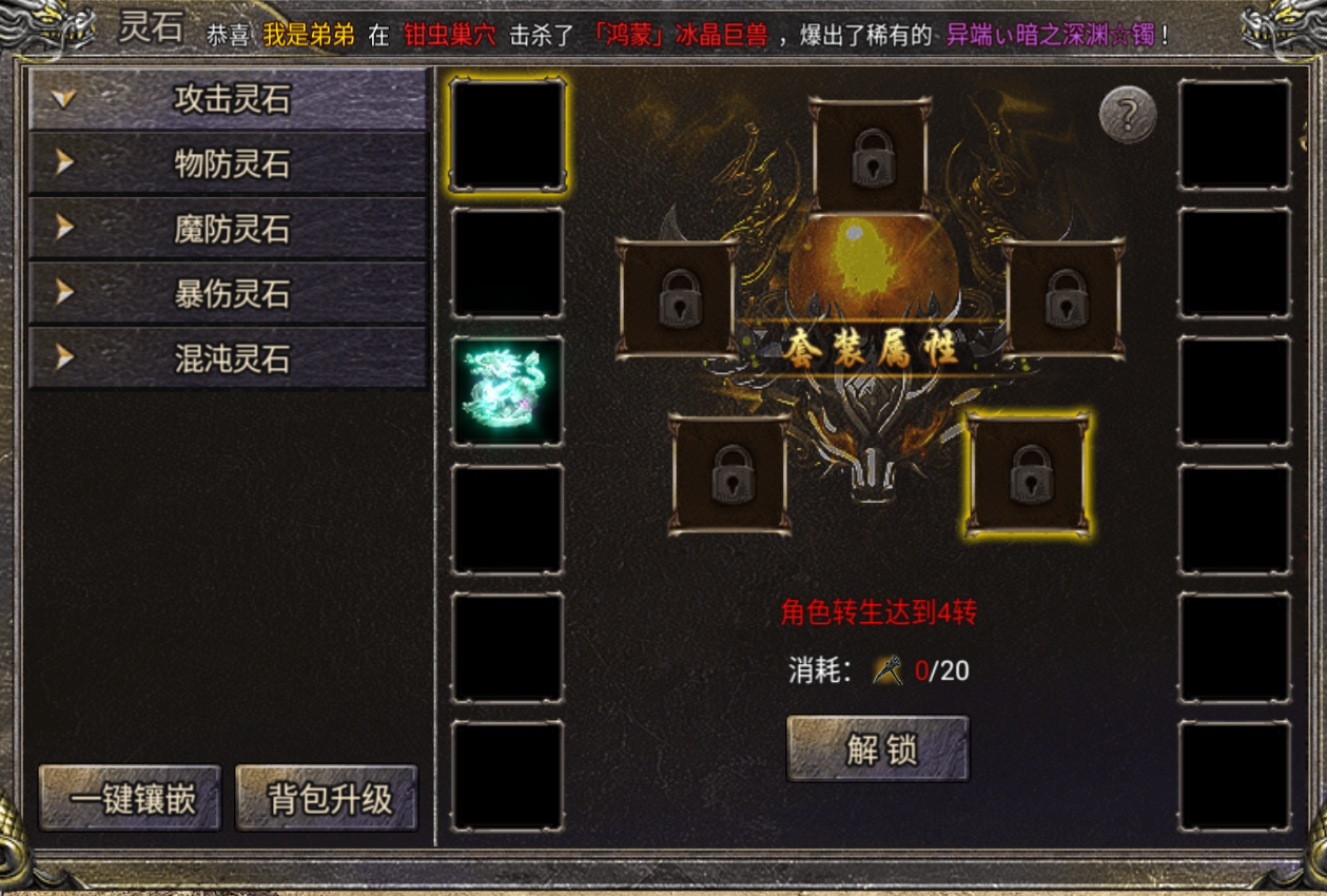 5种灵石分别为攻击灵石、物防灵石、魔防灵石、暴伤灵石、混沌灵石。我们可以通过灵石界面进行灵石升级,也可以进入合成,合成高等级灵石。镶嵌的灵石总等级越高,套装属性越强。当神器被击落或没有穿戴神器时,灵石属性依然生效。