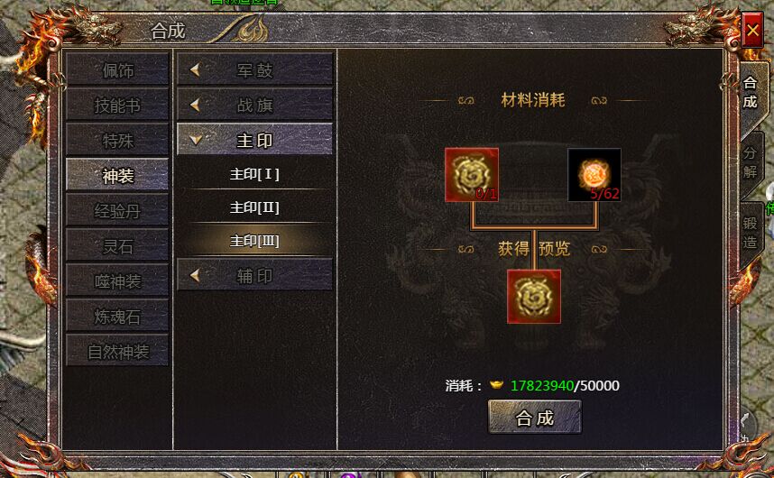 3、主印[Ⅲ]合成:消耗1个主印[Ⅱ]、62个荣誉之魂、5W绑定元宝;