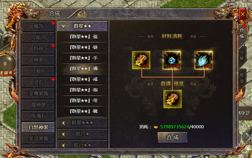 大家要通过附魔提升战力,就要收集一些自然神装,这种装备可通过一些运营获取,或者通过收集材料,在合成-自然神装的合成界面,可合成各种高级的自然神装。