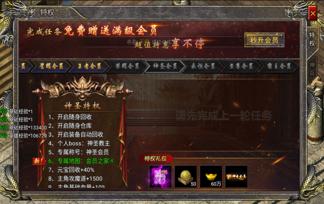 1个8转证书(主角)、50个属性丹(无限制)、60万绑定元宝、1个【神圣会员】称号。