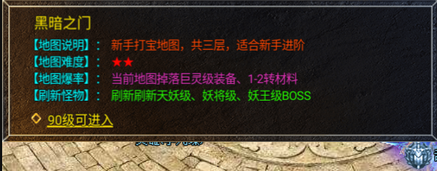 黑暗之门地图会掉落巨灵级装备还有1-2转的转生材料哦。在地图里会刷新天妖级、妖将级还有妖王级BOSS,小伙伴们可以根据自身的条件选择是否进入哦。