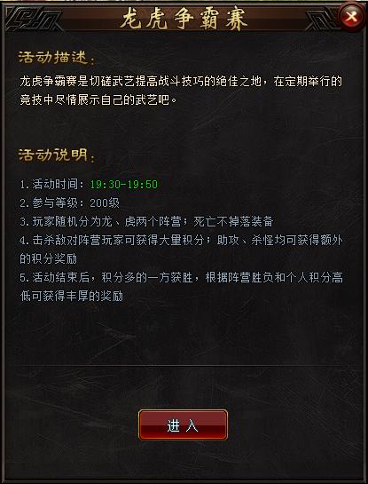 龙虎争霸赛每日晚19:30-19:50开启,玩家200级后可参与活动。