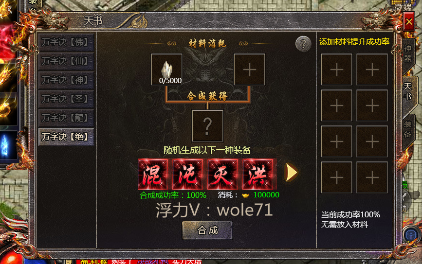 大家直接击败各种高级的首领BOSS,无法直接掉落这种装备。只可以收集材料进行合成,有一定几率获得低阶的万字诀装备。大家需要高级万字诀装备,就要收集【创造宝石】的道具,前往庄园的NPC“神界使者”处,进入到天书界面,可以合成一些高级的万字诀装备。