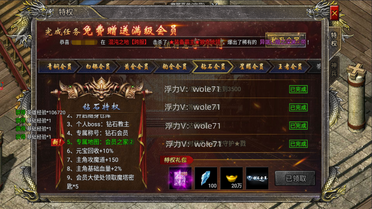 1个4转证书(主角)、100个玉佩碎片、20万绑定元宝、1个【钻石会员】称号