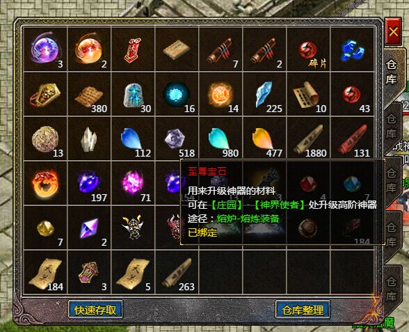 传奇霸主至尊宝石的使用,要找到庄园里的NPC“神界使者”对话,可以进入到神器合成界面,可以合成2-9阶的神器。玩家合成神器时,需要准备低一级的神器作为合成材料,并消耗对应的至尊宝石,即可随机合成任意一种更高级的神器,合成过程中需要消耗10W元宝。