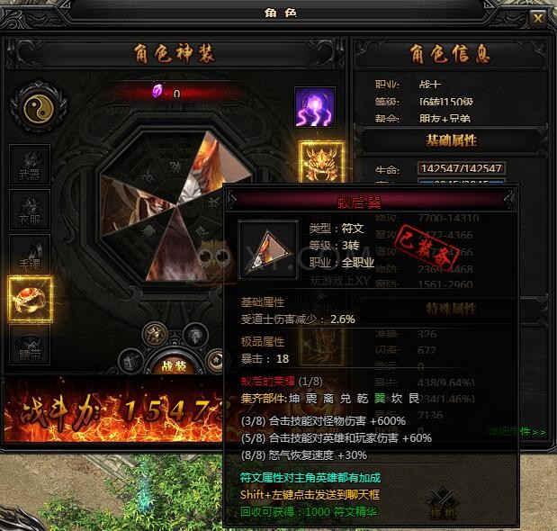 蓝月传奇符文是个充满神秘感的系统,符文共分8格分别用:乾、坤、震、巽、坎、离、艮、兑进行命名。当玩家将符文放置符文盘中便能获得属性,同一级别的八块符文镶嵌在符文盘上,更可以获得额外的套装效果。
