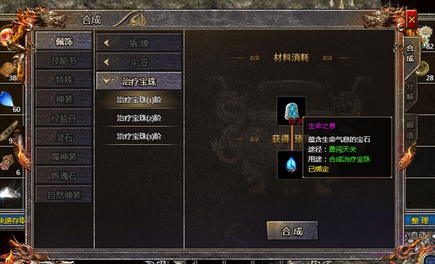 小伙伴们获得大量的生命之息后,可以进入到合成系统里的佩饰合成界面,找到治疗宝珠的合成操作界面。大家直接消耗20个生命之息,即可合成治疗宝珠1阶,后期就利用前一阶的治疗宝珠和相应的生命之息材料,就能不断提升你身上的治疗宝珠等级,并获得攻击/魔法/道术、生命、提升药物回复效果、自动回复生命/魔法值的属性效果的。