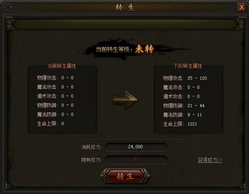 转生等级提升需要消耗转生修为,可以通过活动、礼包、商城等得到的修为丹来获取修为,也可通过消耗经验和金币兑换大量修为。