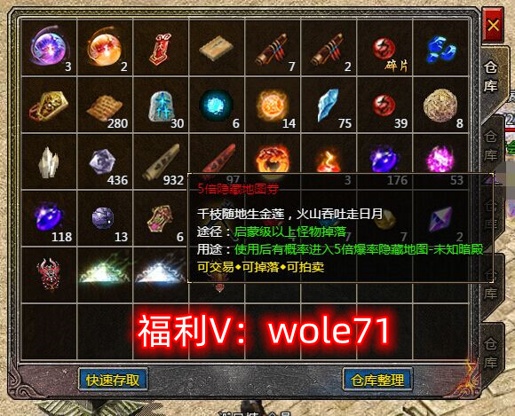 大家要想获得【5倍隐藏地图券】,可以通过击杀各种首领,可有较高概率掉落这种道具的。大家进入未知暗殿挂机刷怪,可享受5倍掉率的哟。每张【5倍隐藏地图券】使用后,只可以逗留2小时,而且不支持叠加的。