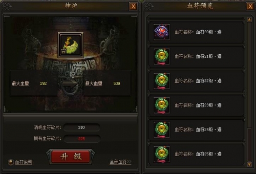 血符分为25级,等级越高的血符能够提供给角色更高的生命值加成,让你在打BOSS、PK当中不在为血少而烦恼。
