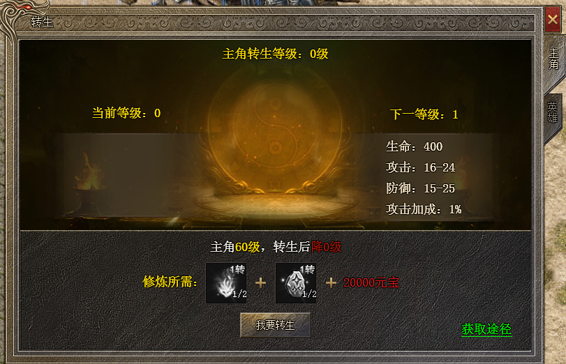 转生是游戏中一个比较重要的成长线,当角色达到一定等级,获得经验值后就不能提升等级,必须通过转生突破等级上限,转生后返回累计的经验值。