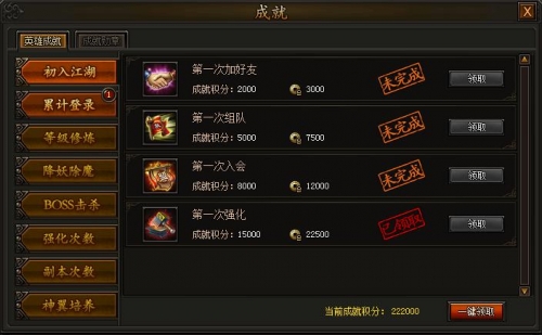 通过击杀怪物、通关副本、升级装备、参与活动等,均可得到大量的成就积分。