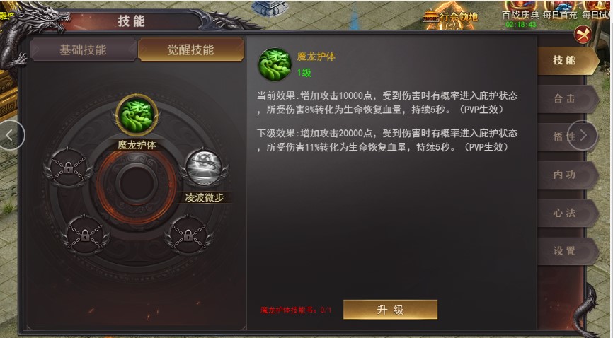 魔龙护体:每级增加攻击属性。受到伤害时,有几率进入庇护状态,所受伤害的百分比转化为生命恢复血量,持续5秒。(PVP有效)