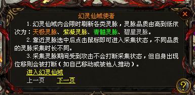 融合了打宝、PK和采集资源的玩法,通过幻灵仙域使者(中州广场107,94)进入。采集灵脉即可获得丰厚的奖励。固定时间还有强大的Boss翡翠古龙登场,击杀的奖励极其丰厚!