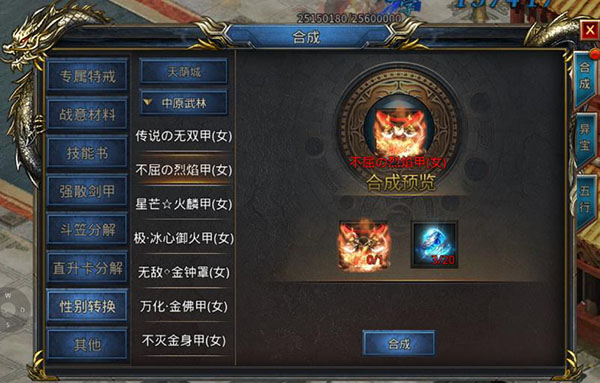 3、可将装备进行性别转换,将需要转换的装备+进化之石放入合成即可。