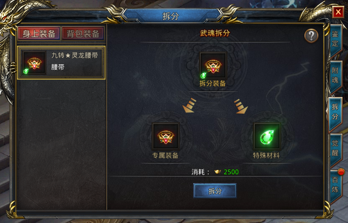 拆分可以将附魔后的专属装备拆分城原装备和武魂石或对应部位的江湖异宝、五行异宝。