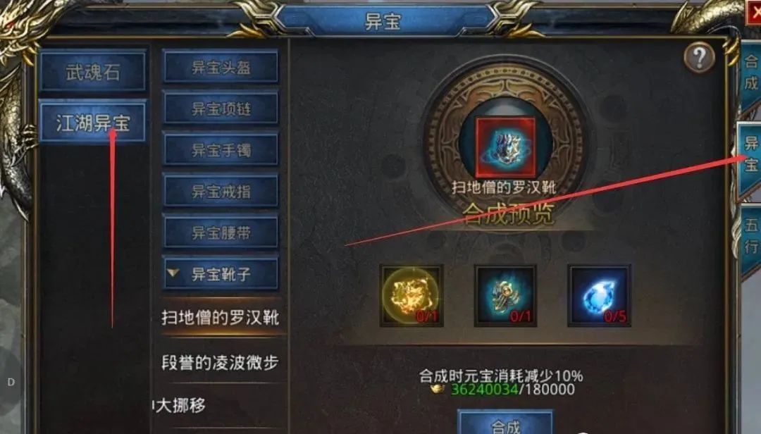 合成异宝不仅需要装备还需要武魂石,各种活动中也能够获取到江湖异宝(如:天池十二宫、轩辕主殿、累计充值活动、合区活动),如果前期到了八转想尽快完成风云必胜活动——达成三个二阶异宝装备条件的话,第二件跟第三件在战意也就是转生8的时候点天池十二宫 进中原的十二宫 最后一层每天会给一件二阶。