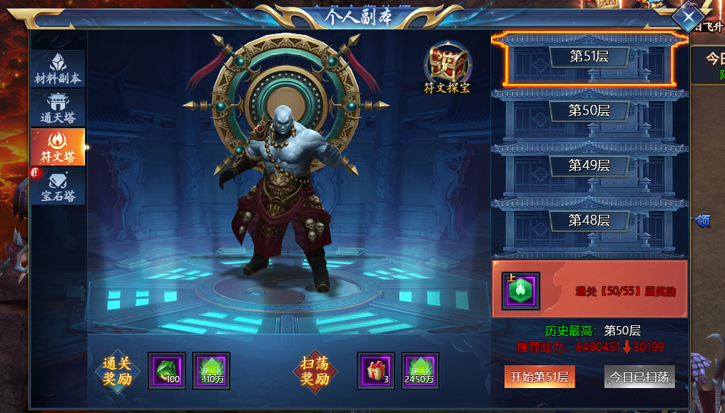 金丹初期可开启符文塔,符文可在技能-法则符文除查看。玩家可以通过挑战符文塔到达指定层数获取奖励,每层可获得符文经验及人物经验,符文经验可用于强化符文。