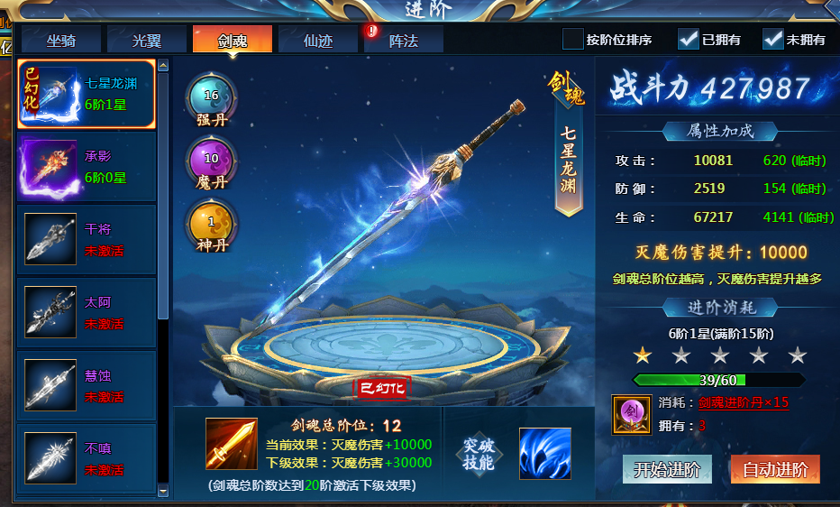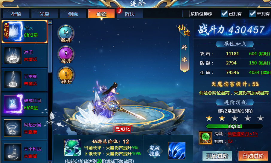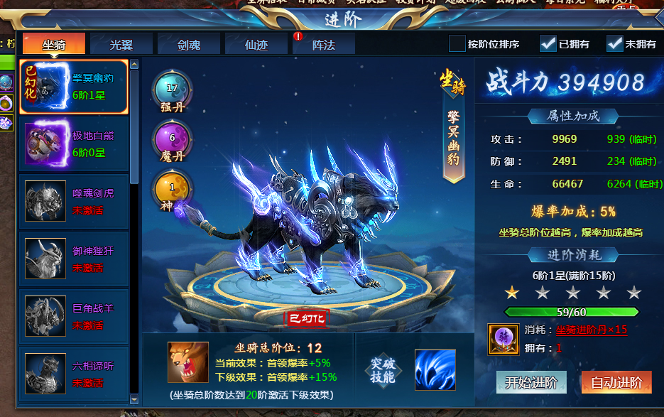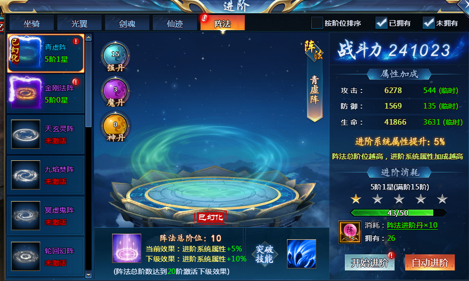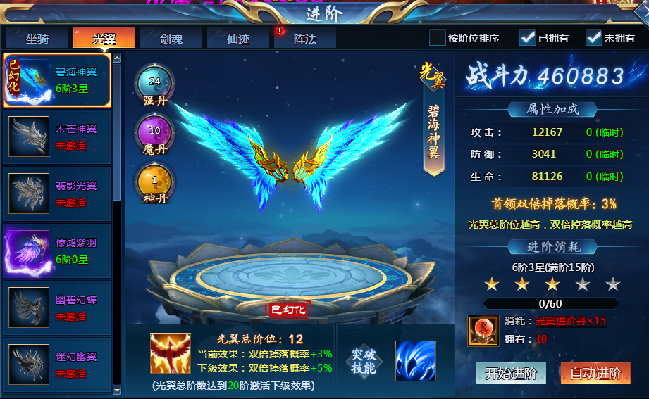 进阶系统共有坐骑、光翼、剑魂、仙迹、阵法五类