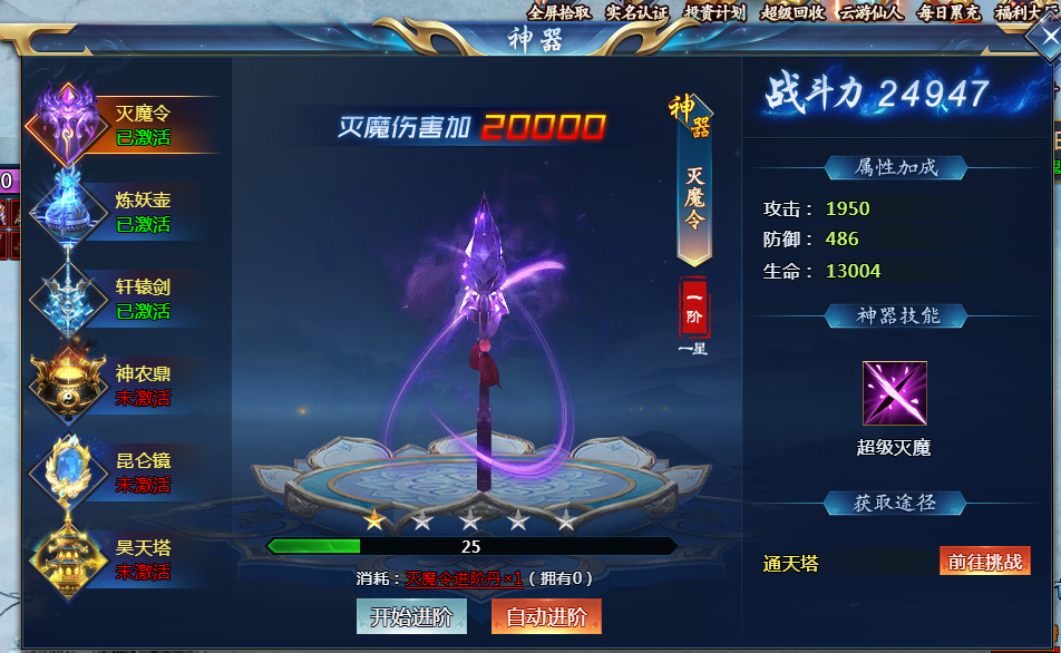 炼气初期开启神器功能,共有:灭魔令、炼妖壶、轩辕剑、神农鼎、昆仑镜、昊天塔 六种神器;可通过挑战“个人副本”中的“通天塔”获得神器碎片,集齐一定碎片可以激活对应神器,每种神器都有一个专属技能。