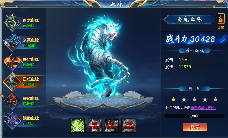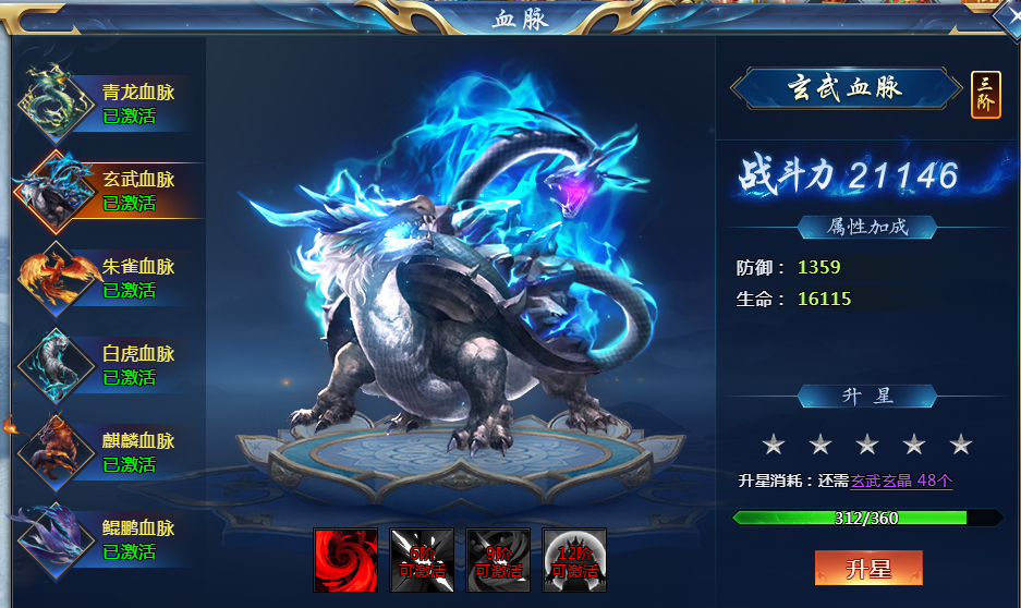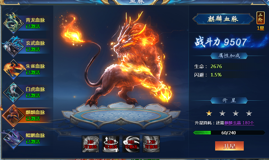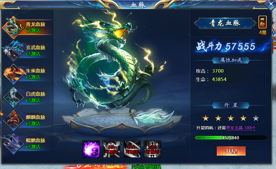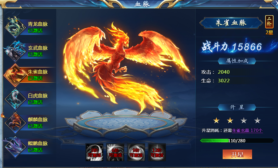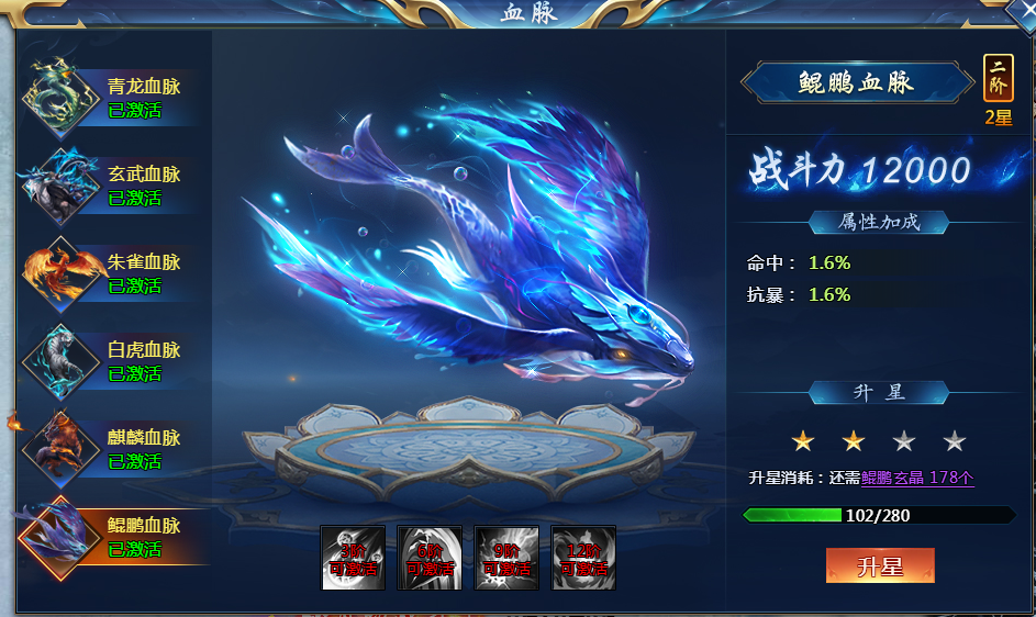 共有青龙血脉、玄武血脉、朱雀血脉、白虎血脉、麒麟血脉、鲲鹏血脉这六种血脉;每种血脉都提供有两种属性加成,提升血脉等阶可以同步提升属性加成,血脉提升到一定等阶时也会激活相应的技能