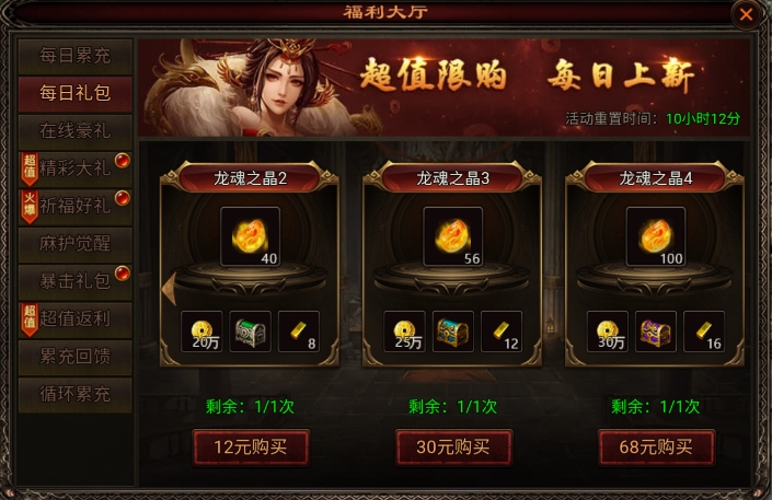 1. 每日累充奖励:玩家每天可以通过累充一定金额,获得龙魂之晶和通宝的奖励。