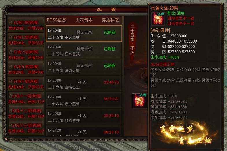 挑战凶兽BOSS:每天11至24点开放此挑战,之后会转为跨服活动。通过“BOSS挑战”图标进入信息界面,依据龙魂等级和开服天数,进入相应幻境地图与BOSS激战。