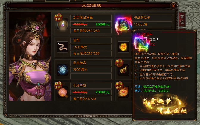 如果奇遇礼包错过了,大家还可以在开服108天的时候去商城入手骑战激活卡,需要180000元宝,终身限购一次。