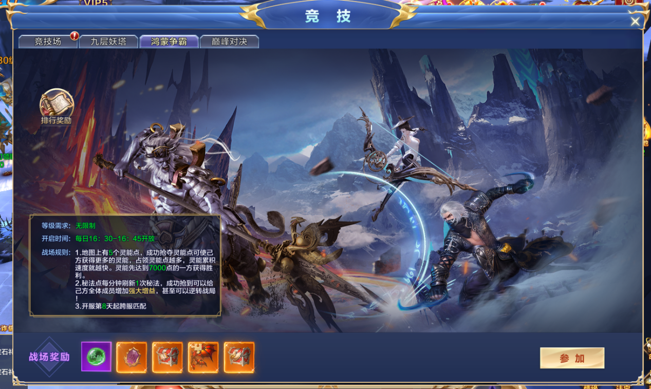 活动说明:多人限时竞技活动,活动开启三分钟内可进入,将参与玩家随机分入“鸿蒙”“混沌”两个阵营,通过抢夺地图上的5个灵能点或击杀地方阵营的玩家获得灵能,灵能值优先达到7000点的一方阵营将获得胜利。