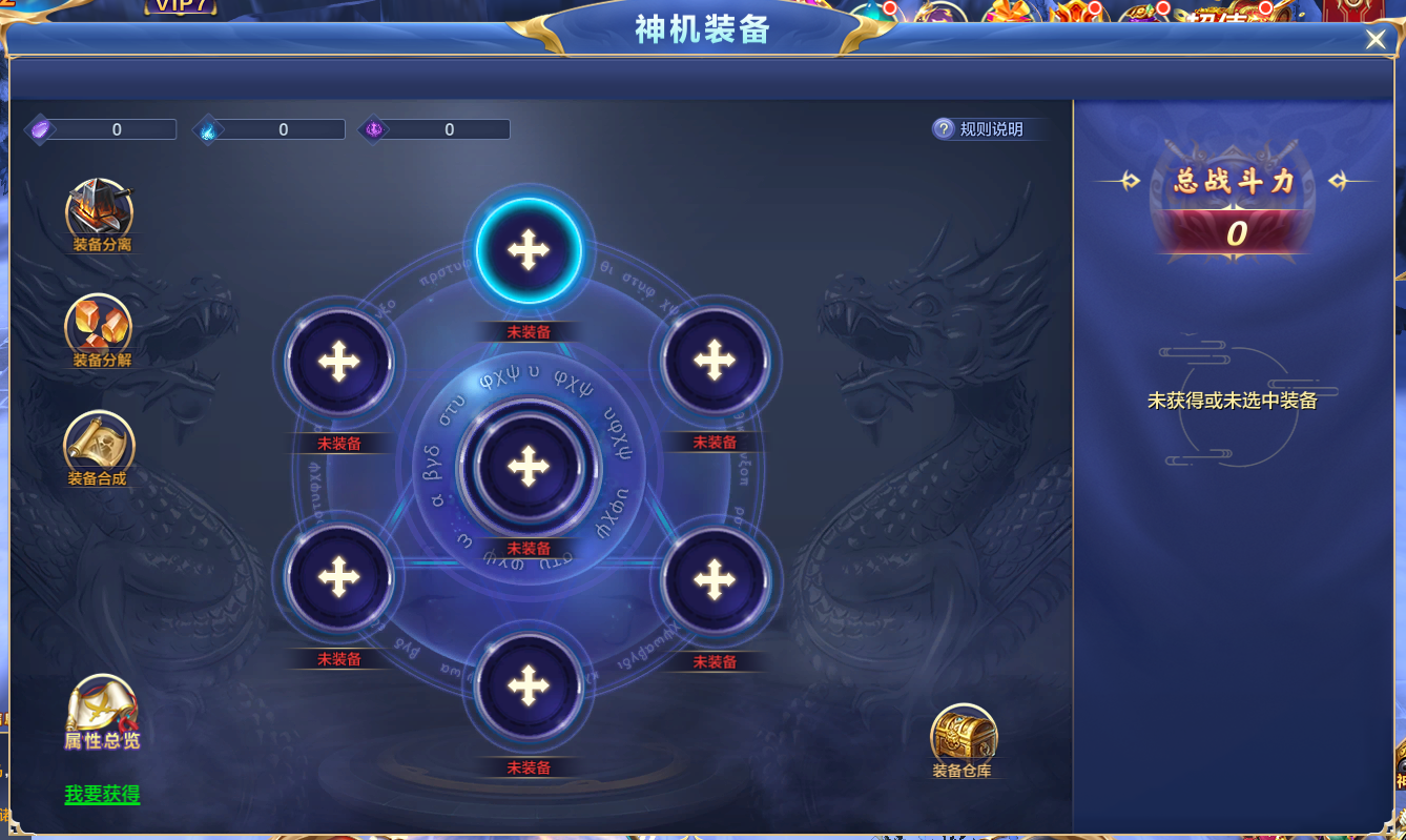 功能解锁后,点击右下角“神级”图标即可进入,共计可穿戴6件不同属性的普通装备和1件核心装备。