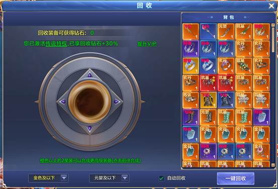 在高等级情况下,不需要的装备可以通过回收功能转化为海量钻石,所以平常打BOSS获得的多余装备一定不要扔,在回收界面回收,可以获得大量的钻石奖励哦!