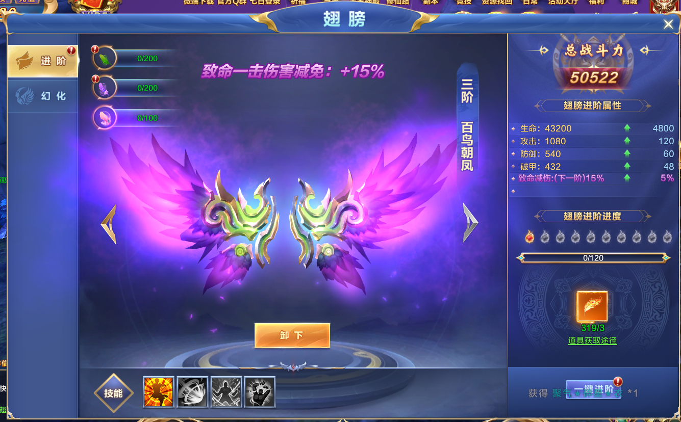 随着翅膀的阶数提升还会解锁不同的被动技能。