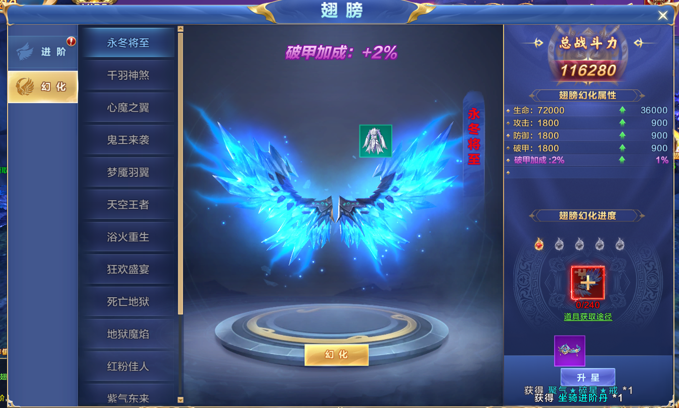集齐对应的激活道具可解锁翅膀幻化,增加角色属性。