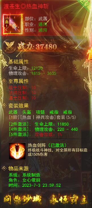 热血神装增加pk加成,套装属性可增加生命百分比,更有终极战斗神技--热血剑阵,对全屏所有目标造成150%的伤害。