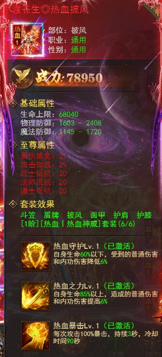 热血神饰至尊属性增加可增加对各职业的压制和抵抗,套装更有热血守护、热血之力、热血暴击超级技能,大幅提升pk能力。